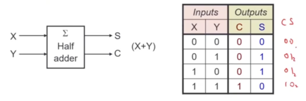 - circuit that adds 2 single bits (X, Y) to produce a result of 2 bits (C, S).
