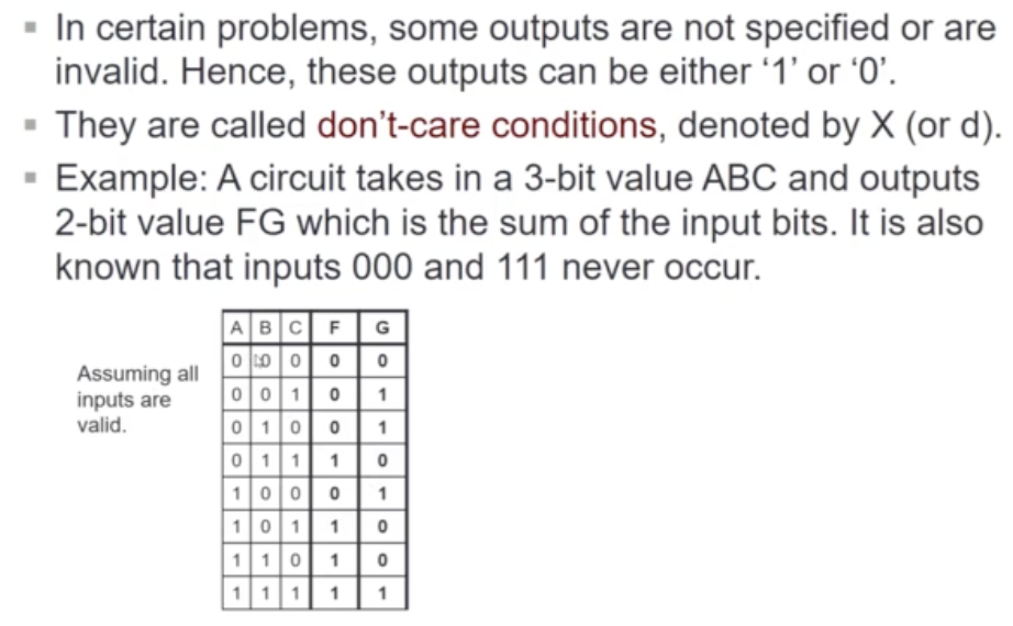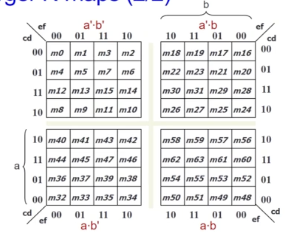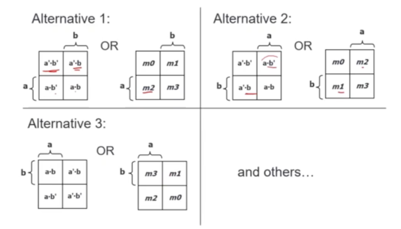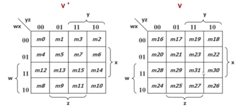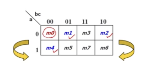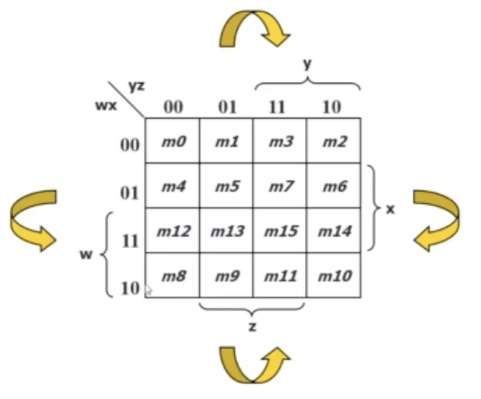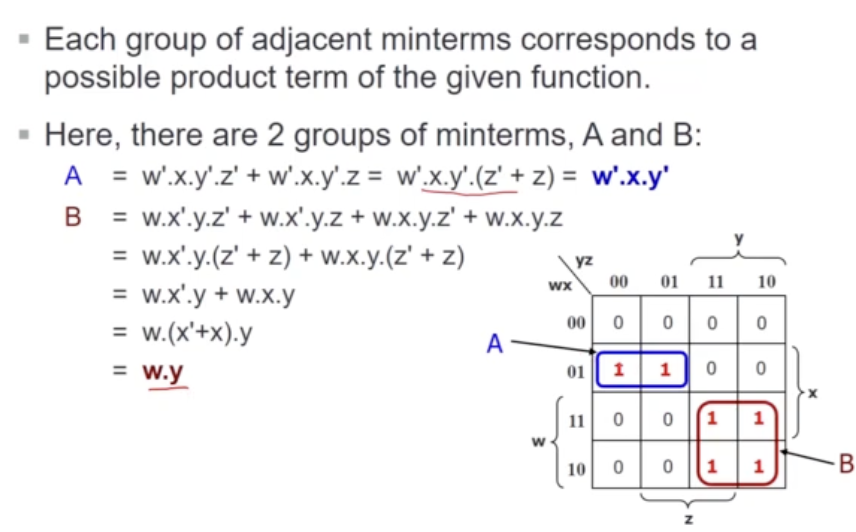 - Each valid grouping of adjacent cells containing ‘1’ then corresponds to a simpler product term of F