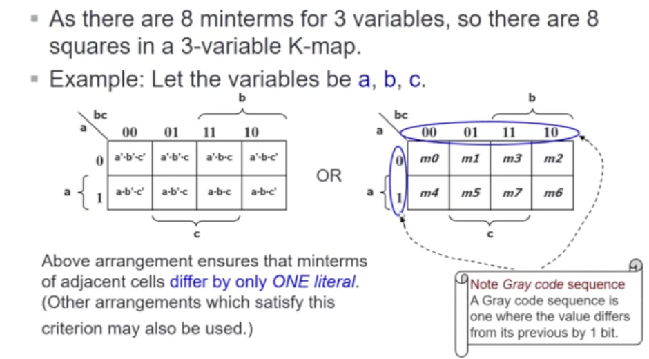 - In a K-map, each cell containing a ‘1’ corresponds to a minterm of a given function F where the output is 1.